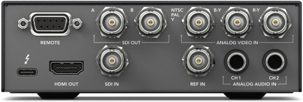 UltraStudio HD Mini verfügt über professionelle Anschlüsse in Broadcast-Qualität, darunter 3G-SDI, analoge YUV- und Composite-NTSC/PAL-Videoeingänge sowie einen Referenzeingang. Es gibt auch zwei ¼“-Audioanschlüsse für analoge Audioeingänge, die mit symmetrischen und HiFi-Quellen funktionieren. Darüber hinaus kann UltraStudio HD Mini professionelle Broadcast-Decks über den eingebauten RS-422-Anschluss fernsteuern. Für die Ausgabe gibt es Dual-Link-3G-SDI mit Fill und Key sowie einen HDMI-Anschluss für die Videoüberwachung mit einem Grossbildfernseher.